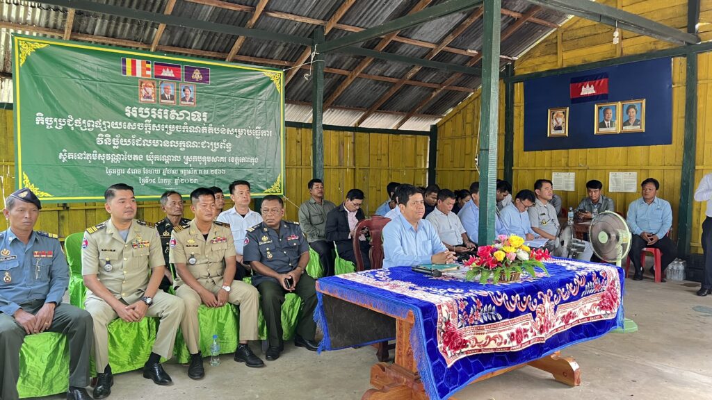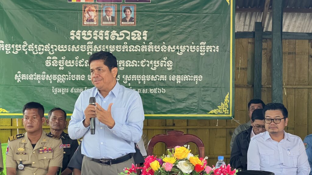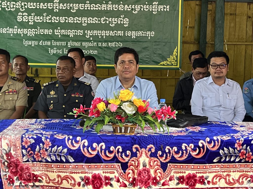 លោក ក្រូច បូរីសីហា អភិបាល នៃគណៈអភិបាលស្រុក បានអញ្ជើញចូលរួមជាគណៈអធិបតី ក្នុងកិច្ចប្រជុំផ្សព្វផ្សាយសេចក្តីសម្រេចប្រកាសតំបន់វិនិច្ឆ័យ សម្រាប់ការចុះបញ្ជីដីធ្លីមានលក្ខណៈជាប្រព័ន្ធចំនួន ០១ភូមិ នៅភូមិសុវណ្ណបៃតង ឃុំកណ្តោល ស្រុកបូទុមសាគរ ខេត្តកោះកុង