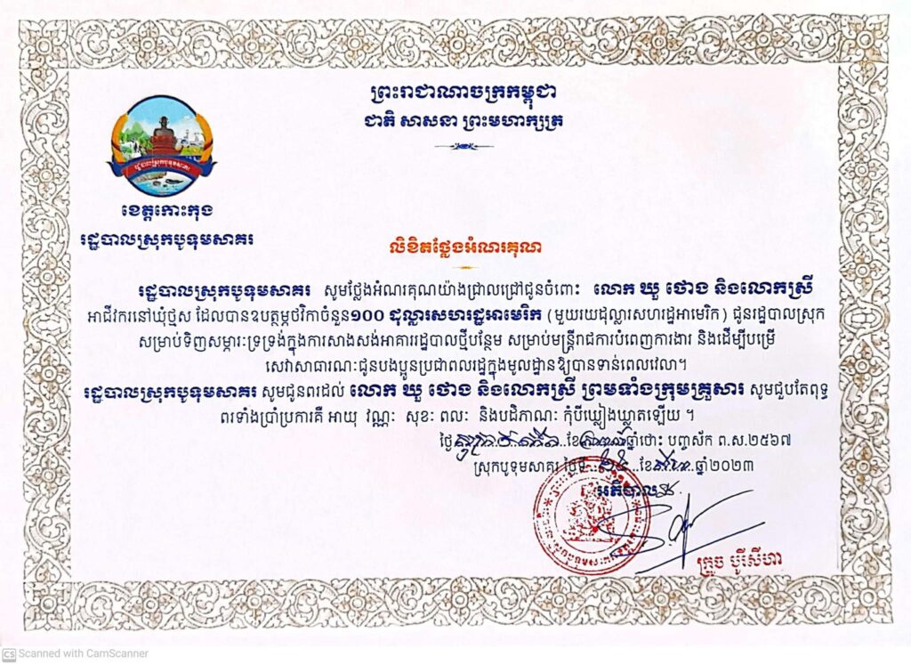 រដ្ឋបាលស្រុកបូទុមសាគរ សូមថ្លែងអំណរគុណយ៉ាងជ្រាលជ្រៅជូនចំពោះលោក ឃួ ថោង និងលោកស្រី អាជីវករនៅឃុំថ្មសដែលបានឧបត្ថម្ភថវិកាចំនួន ១០០ ដុល្លារ (មួយរយដុល្លារសហរដ្ឋអាមេរិក) ជូនរដ្ឋបាលស្រុកសម្រាប់ទិញសម្ភារៈទ្រទ្រង់ក្នុងការសាងសង់អាគាររដ្ឋបាលថ្មីបន្ថែម សម្រាប់មន្ត្រីរាជការបំពេញការងារ និងដើម្បីបម្រើ សេវាសាធារណៈជូនបងប្អូនប្រជាពលរដ្ឋក្នុងមូលដ្ឋានឱ្យបានទាន់ពេលវេលា