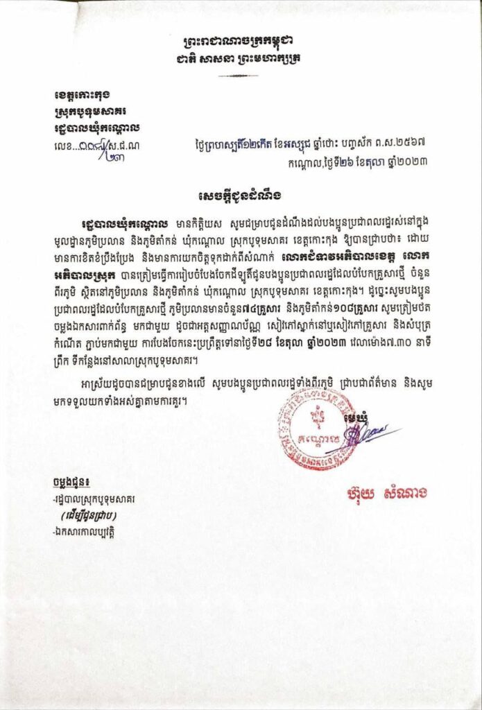 រដ្ឋបាលឃុំកណ្ដោល មានកិត្តិយសសូមជូនដំណឹងដល់បងប្អូនប្រជាពលរដ្ឋ ក្នុងមូលដ្ឋានភូមិ តាំកន់ និង ភូមិប្រលាន ដោយមានការយកចិត្តទុកដាក់ពីសំណាក់លោកជំទាវអភិបាលខេត្ត លោកអភិបាលស្រុកបានធ្វើការរៀបចំបែងចែកដីឡូត៍ជូនបងប្អូនចំពោះគ្រួសារបំបែកថ្មីដែលមានទីលំនៅខាងលើសូមត្រៀមថតចម្លងមកជាមួយដូចជា អត្តសញ្ញាណប័ណ្ណ សៀវភៅស្នាក់នៅ ឬសៀវភៅគ្រួសារ សំបុត្រកំណើត ភ្ជាប់មកជាមួយការបែងចែកនេះនិងប្រព្រឹត្តទៅនាថ្ងៃថ្ងៃទី ២៨ខែតុលា ឆ្នាំ២០២៣ នៅសាលាស្រុកបូទុមសាគរ ។