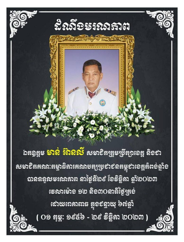 ក្រុមប្រឹក្សាខេត្តកោះកុង សូមចូលរួមរំលែកទុក្ខដ៏ក្រៀមក្រំ ជាមួយក្រុមគ្រួសារនៃសព ឯកឧត្ដម មាន់ អ៊ានលី សមាជិកក្រុមប្រឹក្សាខេត្តកំពង់ឆ្នាំង។