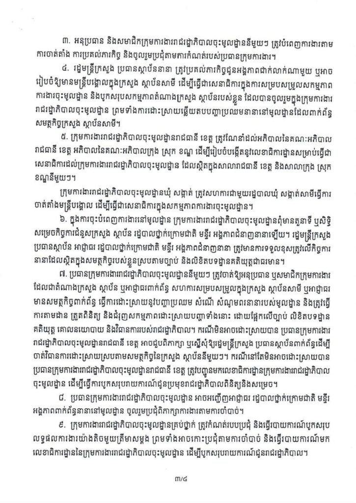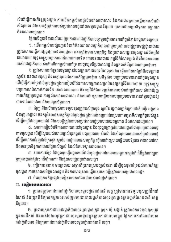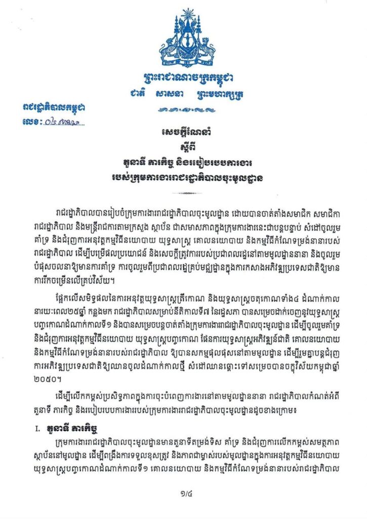 សេចក្តីណែនាំ ស្តីពី តួនាទី ភារកិច្ច និងរបៀបរបបការងារ របស់ក្រុមការងាររាជរដ្ឋាភិបាលចុះមូលដ្ឋាន។ថ្ងៃសៅរ៍ ៥ រោច ខែកត្តិក ឆ្នាំថោះ បញ្ចស័ក ពុទ្ធសករាជ ២៥៦៧ ត្រូវនឹងថ្ងៃទី២ ខែធ្នូ ឆ្នាំ២០២៣ December 2, 2023