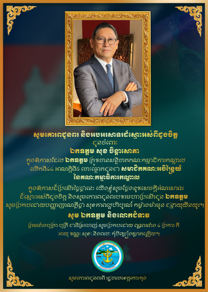 សូមគោរពជូនពរ និងអបអរសាទរដ៏ស្មោះអស់ពីដួងចិត្ត ជូនចំពោះឯកឧត្ដម សុខ ចិន្តាសោភា ក្នុងឱកាសដែលអង្គមហាសន្និបាតសាមញ្ញតំណាងទូទាំងប្រទេសរបស់គណបក្សប្រជាជនកម្ពុជា លើកទី៤៤ អាណត្តិទី៥ បោះឆ្នោតគាំទ្រ ឯកឧត្តម ជាសមាជិកគណៈអចិន្ត្រៃយ៍ នៃគណៈកម្មាធិការកណ្តាល នាថ្ងៃទី១០ ខែធ្នូ ឆ្នាំ២០២៣ សូមគោរពជូនពរ ពីរដ្ឋបាលខេត្តកោះកុង