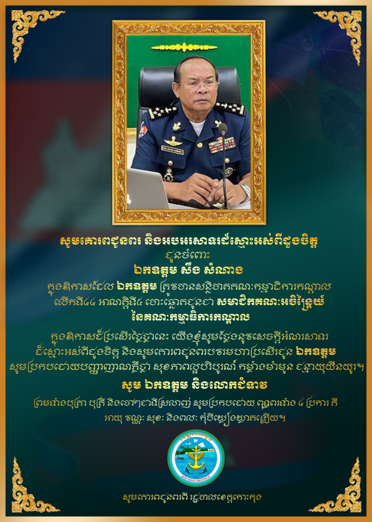 សូមគោរពជូនពរ និងអបអរសាទរដ៏ស្មោះអស់ពីដួងចិត្ត ជូនចំពោះឯកឧត្ដម សឹង សំណាង ក្នុងឱកាសដែលអង្គមហាសន្និបាតសាមញ្ញតំណាងទូទាំងប្រទេសរបស់គណបក្សប្រជាជនកម្ពុជា លើកទី៤៤ អាណត្តិទី៥ បោះឆ្នោតគាំទ្រ ឯកឧត្តម ជាសមាជិកគណៈអចិន្ត្រៃយ៍ នៃគណៈកម្មាធិការកណ្តាល នាថ្ងៃទី១០ ខែធ្នូ ឆ្នាំ២០២៣ សូមគោរពជូនពរ ពីរដ្ឋបាលខេត្តកោះកុង