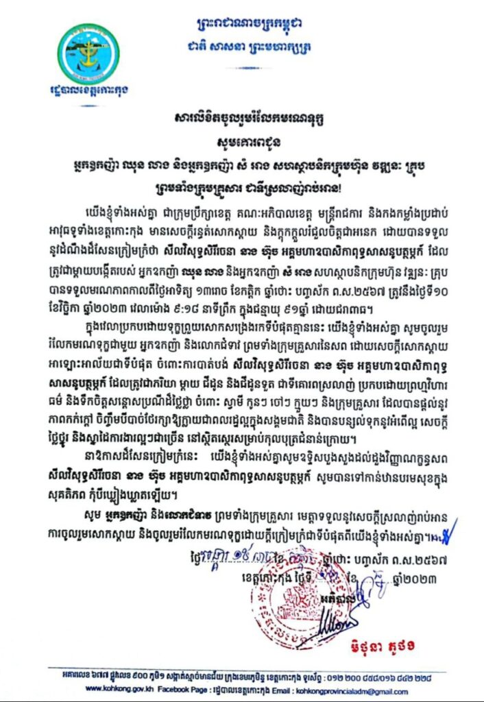 សារលិខិតចូលរួមរំលែកមរណទុក្ខ សូមគោរពជូន អ្នកឧកញ៉ា ឈុន លាង និងអ្នកឧកញ៉ា សំ អាង សហស្ថាបនិកក្រុមហ៊ុន វឌ្ឍនៈ គ្រុប ព្រមទាំងក្រុមគ្រួសារ
