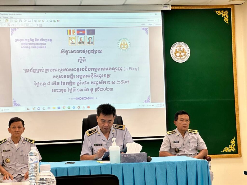 លោក​ ខា​ លាងហុង​ អនុប្រធានការិយាល័យរដ្ឋបាល​ និងហិរញ្ញវត្ថុ​ បានចូលរួមវគ្គសិក្ខាសាលាស្តីពីប្រព័ន្ធគ្រប់គ្រងការប្រកាសពន្ធអាជីវកម្មតាមអនឡាញ(e-Filling)​ ក្រោមអធិបតីភាព​ លោក​ ចំរេីន​ ទូច​ ប្រធានសាខាពន្ធដាខេត្តកោះកុង