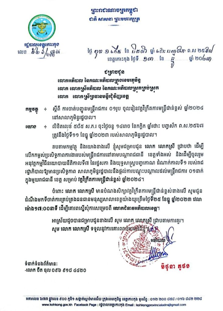 សេចក្តីជូនដំណឹង ស្តីពីការចាត់បញ្ចូនមន្ត្រីរាជការ ០១រូប ចូលរៀនវគ្គវិក្រឹតការមន្ត្រីជាន់ខ្ពស់ ឆ្នាំ២០២៤ នៅសាលាភូមិន្ទរដ្ឋបាល។