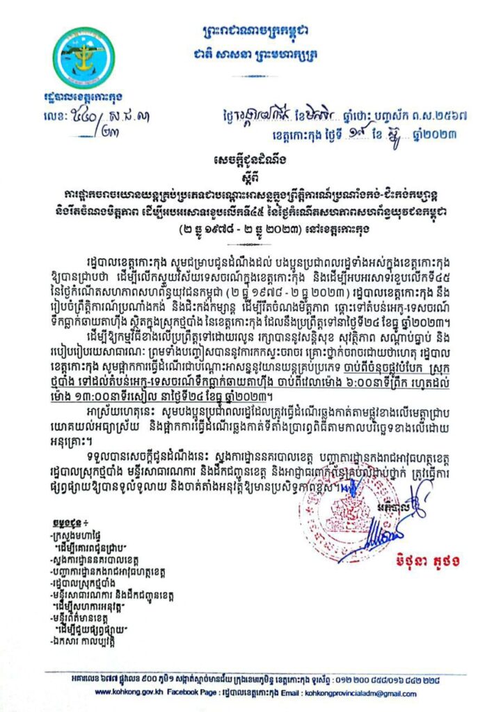 សេចក្តីជូនដំណឹង ស្តីពីការផ្អាកចរាចរយានយន្តគ្រប់ប្រភេទជាបណ្តោះអាសន្ន ក្នុងព្រឹត្តិការណ៍ប្រណាំងកង់-ជិះកង់កម្សាន្ត និងរឹតចំណងមិត្តភាព ដើម្បីអបអរសាទរខួបលើកទី៤៥ នៃថ្ងៃកំណើតសហភាពសហព័ន្ធយុវជនកម្ពុជា (២ ធ្នូ ១៩៧៨ – ២ ធ្នូ ២០២៣) នៅខេត្តកោះកុង