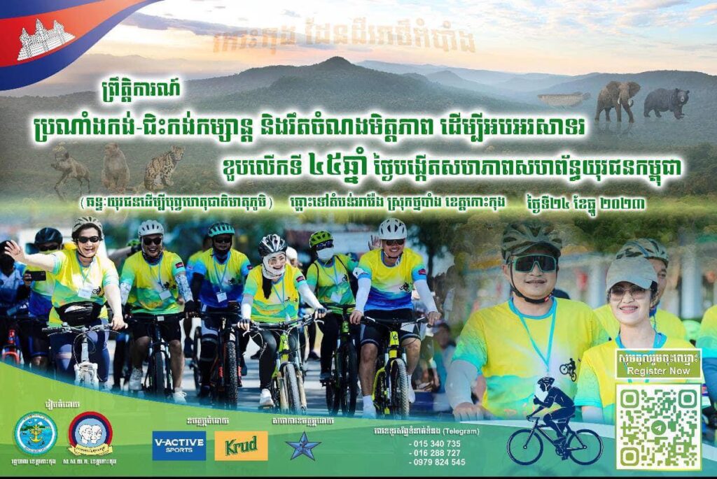 លោកស្រី អែម សុធារ៉ា អនុប្រធានទទួលបន្ទុករួម នៃមន្ទីរកសិកម្ម រុក្ខាប្រមាញ់ និងនេសាទខេត្តកោះកុង បានដឹកនាំមន្រ្តីក្រោមឱាទមន្ទីរ ចំនួន ០៣រូប ចូលរួមក្នុងព្រឹត្តិការណ៍ ប្រណាំងកង់-ជិះកង់កម្សាន្តនិងរិតចំណងមិត្តភាព ដើម្បីអបអរសាទរ ខួបលើកទី៤៥ឆ្នាំ ថ្ងៃបង្កើតសហភាពសហព័ន្ធយុវជនកម្ពុជា(២ធ្នូ ១៩៧៨ -២ធ្នូ ២០២៣) ជិះកង់កម្សាន្ត និងរឹតចំណងមិត្តភាព ប្រវែង ៤៥គីឡូម៉ែត្រ ឆ្ពោះទៅតំបន់អារ៉ែង ស្រុកថ្មបាំង ខេត្តកោះកុង