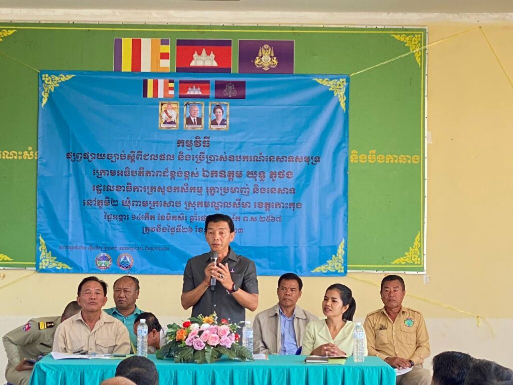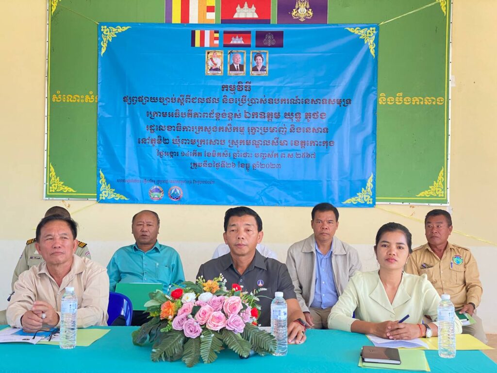 មន្ទីរកសិកម្ម រុក្ខាប្រមាញ់ និងនេសាទខេត្តកោះកុង បានរៀបចំកម្មវិធីផ្សព្វផ្សាយច្បាប់ ស្តីពីជលផល និងប្រើប្រាស់ឧបករណ៍នេសាទសមុទ្រ ជូនដល់ប្រជាពលរដ្ឋចំនួន ០៣ឃុំ សង្កាត់ គឺឃុំកោះកាពិ ស្រុកកោះកុង ឃុំពាមក្រសោប ស្រុកមណ្ឌលសីមា និងសង្កាត់ដងទង់ ក្រុងខេមរភូមិន្ទ ក្នុងខេត្តកោះកុង ក្រោមអធិបតីភាពលោក សុខ ភារម្យ អភិបាល នៃគណៈអភិបាលស្រុកមណ្ឌលសីមា លោក សំ សត្យា អនុប្រធាននាយកដ្ឋានកិច្ចការជលផល និងនិតីកម្ម នៃរដ្ឋបាលជលផល និងនលោកស្រី អែម សុធារ៉ា អនុប្រធានទទួលបន្ទុករួម នៃមន្ទីរកសិកម្ម រុក្ខាប្រមាញ់ និងនេសាទខេត្តកោះកុង។