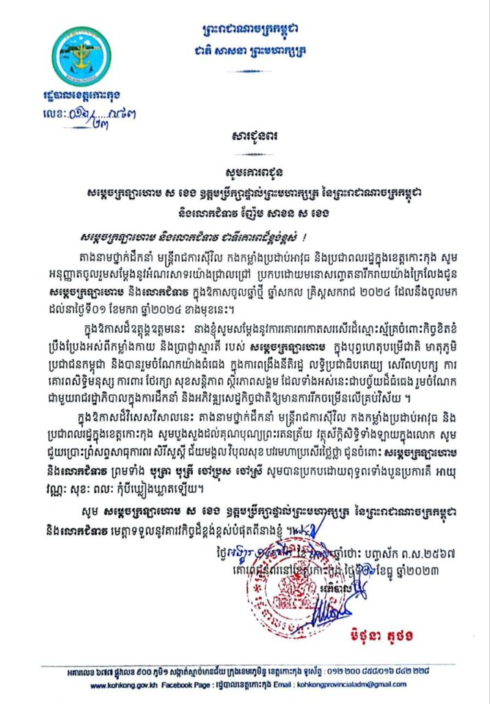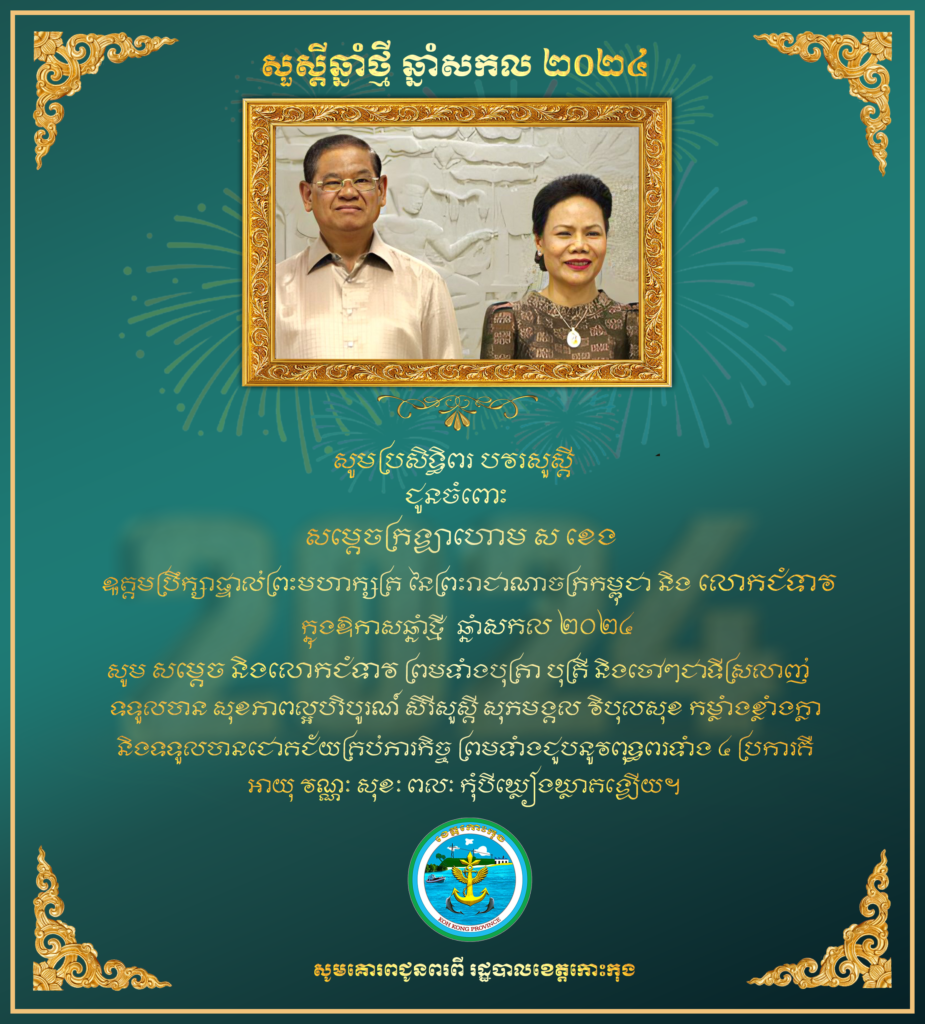 សារជូនពរសូមគោរពជូន សម្តេចក្រឡាហោម ស ខេង ឧត្តមប្រឹក្សាផ្ទាល់ព្រះមហាក្សត្រ នៃព្រះរាជាណាចក្រកម្ពុជា និងលោកជំទាវ ញ៉ែម សាខន ស ខេង ក្នុងឱកាសចូលឆ្នាំថ្មី ឆ្នាំសកល គ្រិស្តសករាជ ២០២៤ ដែលនឹងចូលមកដល់នាថ្ងៃទី០១ ខែមករា ឆ្នាំ២០២៤ ខាងមុខនេះ