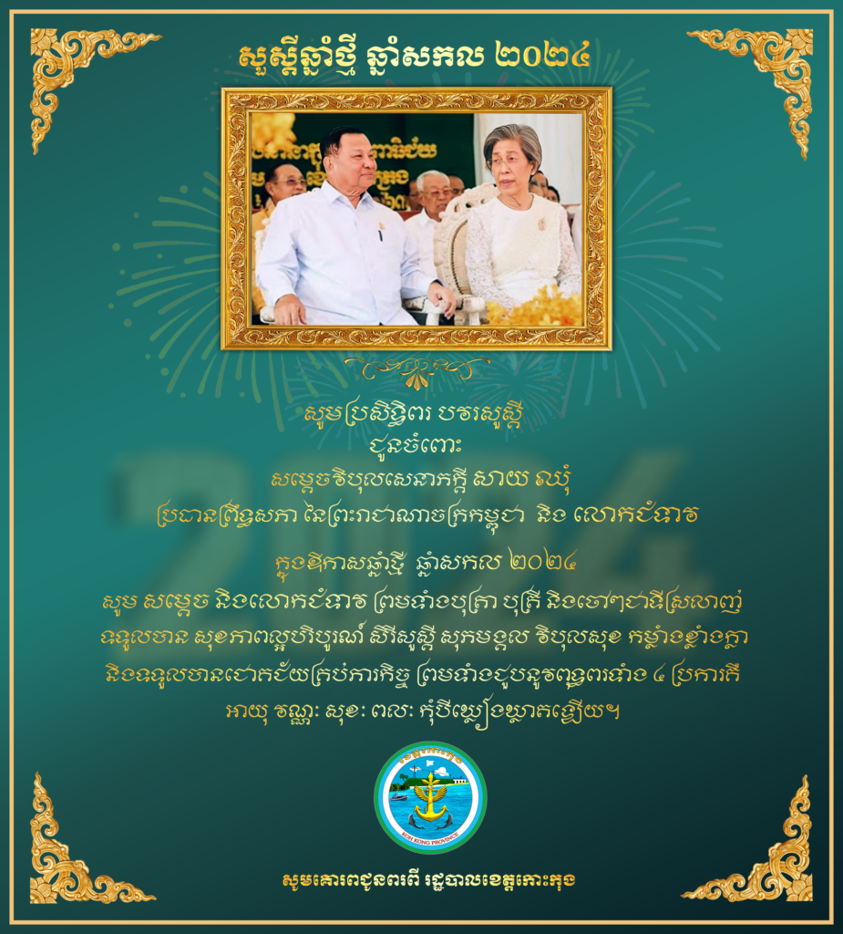 សារជូនពរសូមគោរពជូន សម្តេចវិបុលសេនាភក្តី សាយ ឈុំ ប្រធានព្រឹទ្ធសភា នៃព្រះរាជាណាចក្រកម្ពុជា និងលោកជំទាវ អ៊ូ សាន សាយ ឈុំ ក្នុងឱកាសចូលឆ្នាំថ្មី ឆ្នាំសកល គ្រិស្តសករាជ ២០២៤ ដែលនឹងចូលមកដល់នាថ្ងៃទី០១ ខែមករា ឆ្នាំ២០២៤ ខាងមុខនេះ