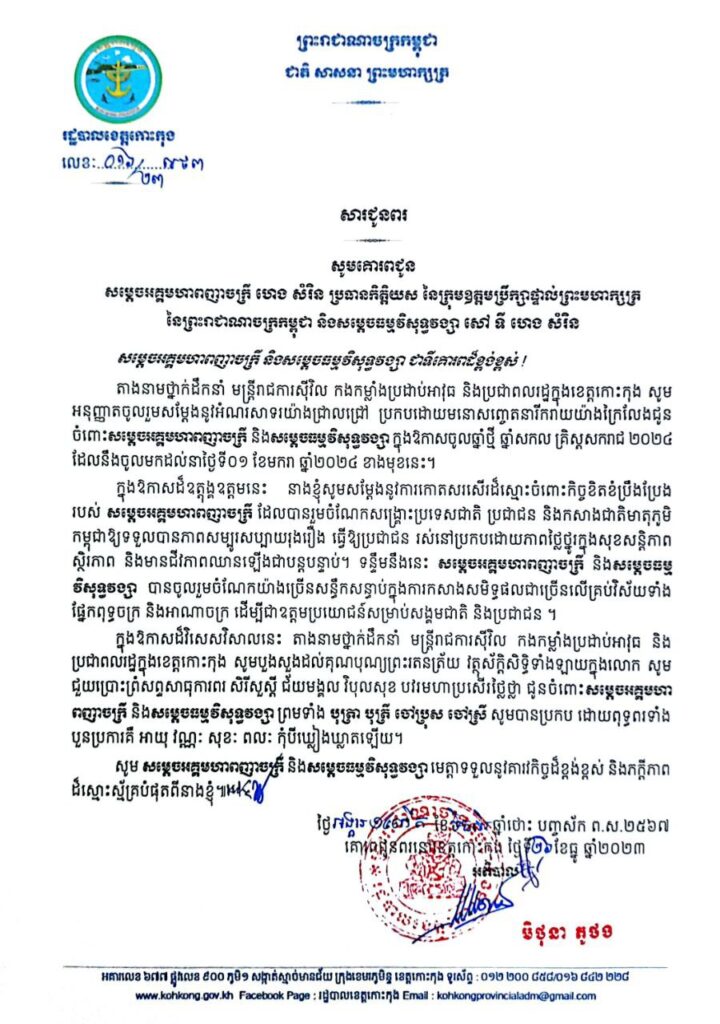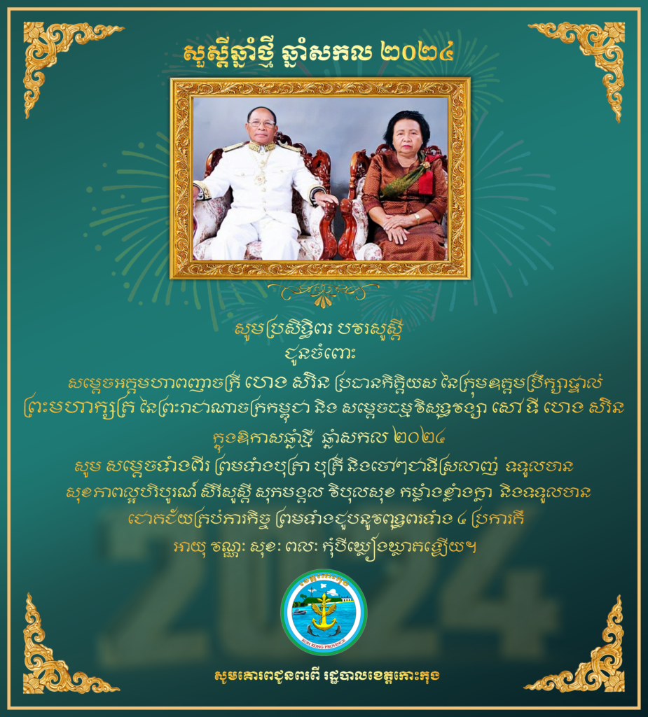 សូមគោរពជូន សម្តេចអគ្គមហាពញាចក្រី ហេង សំរិន ប្រធានកិត្តិយស នៃក្រុមឧត្តមប្រឹក្សាផ្ទាល់ព្រះមហាក្សត្រ នៃព្រះរាជាណាចក្រកម្ពុជា និងសម្តេចធម្មវិសុទ្ធវង្សា សៅ ទី ហេង សំរិន ក្នុងឱកាសចូលឆ្នាំថ្មី ឆ្នាំសកល គ្រិស្តសករាជ ២០២៤ ដែលនឹងចូលមកដល់នាថ្ងៃទី០១ ខែមករា ឆ្នាំ២០២៤ ខាងមុខនេះ