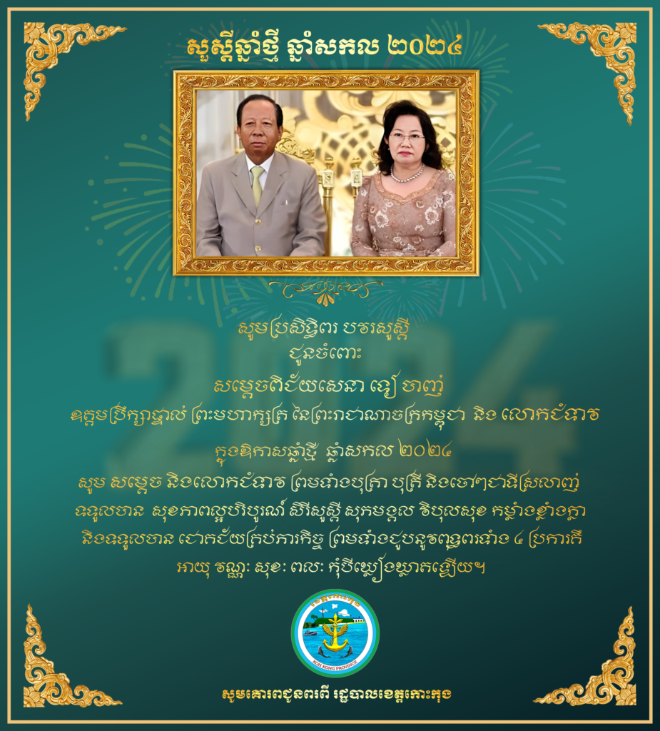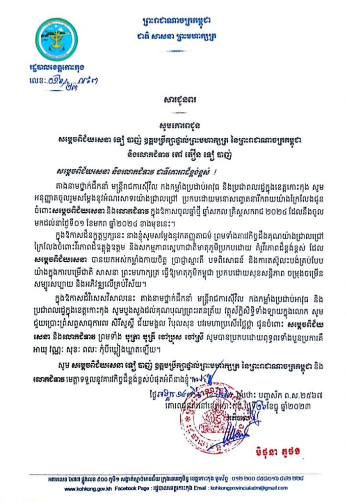 សារជូនពរសូមគោរពជូន សម្តេចពិជ័យសេនា ទៀ បាញ់ ឧត្តមប្រឹក្សាផ្ទាល់ព្រះមហាក្សត្រ នៃព្រះរាជាណាចក្រកម្ពុជា និងលោកជំទាវ តៅ តឿន ទៀ បាញ់ ក្នុងឱកាសចូលឆ្នាំថ្មី ឆ្នាំសកល គ្រិស្តសករាជ ២០២៤ ដែលនឹងចូលមកដល់នាថ្ងៃទី០១ ខែមករា ឆ្នាំ២០២៤ ខាងមុខនេះ