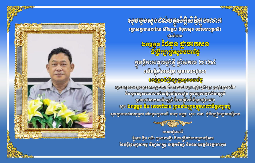 ក្នុងឱកាសឆ្នាំថ្មី ឆ្នាំសកល ២០២៤ ខាងមុខនេះ យើងខ្ញុំជាថ្នាក់ដឹកនាំ មន្រ្តីរាជការ និងមន្ត្រីជាប់កិច្ចសន្យាទាំងអស់ នៃមន្ទីរឧស្សាហកម្ម វិទ្យាសាស្ត្រ បច្ចេកវិទ្យា និងនវានុវត្តន៍ខេត្តកោះកុង