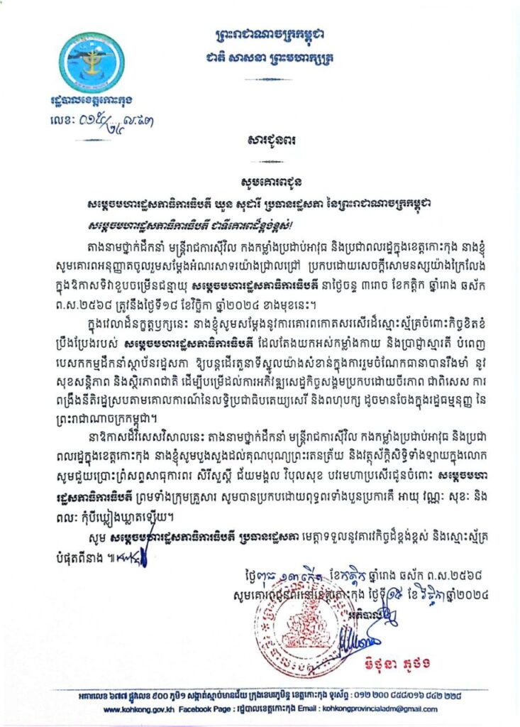 សារជូនពរ សូមគោរពជូនសម្តេចមហារដ្ឋសភាធិការធិបតី យួន សុដារី ប្រធានរដ្ឋសភា នៃព្រះរាជាណាចក្រកម្ពុជា ក្នុងឱកាសទិវាខួបចម្រើនជន្មាយុ សម្តេចមហារដ្ឋសភាធិការធិបតី នាថ្ងៃទី១៨ ខែវិច្ឆិកា ឆ្នាំ២០២៤ ខាងមុខនេះ