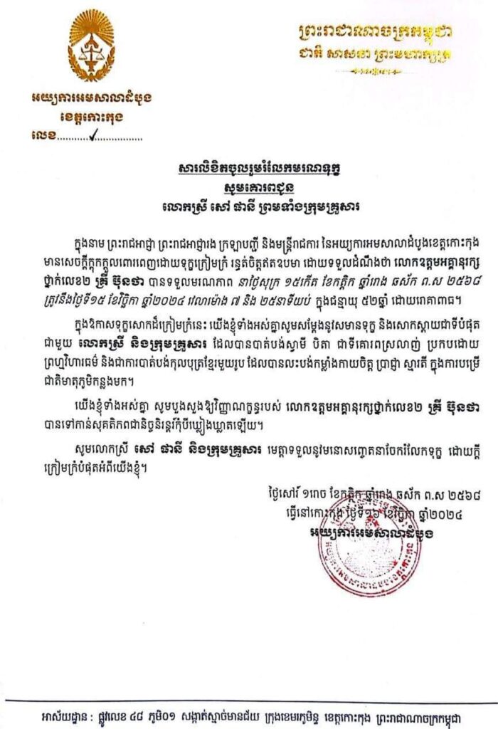 សារលិខិត រំលែកមរណទុក្ខ លោកស្រី សៅ ផានី ព្រមទាំងក្រុមគ្រួសារ របស់អយ្យការអមសាលាដំបូង ខេត្តកោះកុង