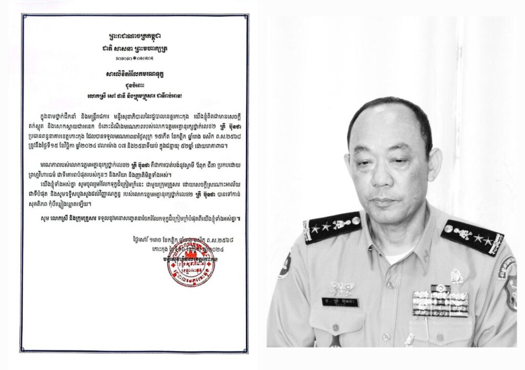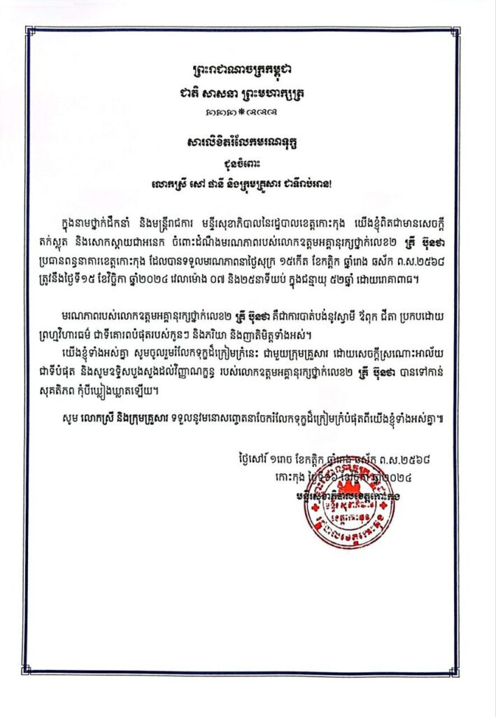 មន្ទីរសុខាភិបាលនៃរដ្ឋបាលខេត្តកោះកុង ចូលរួមរំលែកទុក្ខ ជូនចំពោះ គ្រួសារ នៃសព លោកឧត្តមអគ្គានុរក្ស.២ គ្រី ប៊ុនថា ប្រធានពន្ធនាគារខេត្តកោះកុង ដែលបានទទួលមរណភាព នាថ្ងៃសុក្រ ១៥ កើត ខែកត្តិក ឆ្នាំរោង ឆស័ក ពុទ្ធសករាជ ២៥៦៨ ត្រូវនឹងថ្ងៃទី១៥ ខែវិច្ឆិកា ឆ្នាំ២០២៤ ដោយរោគាពាធ
