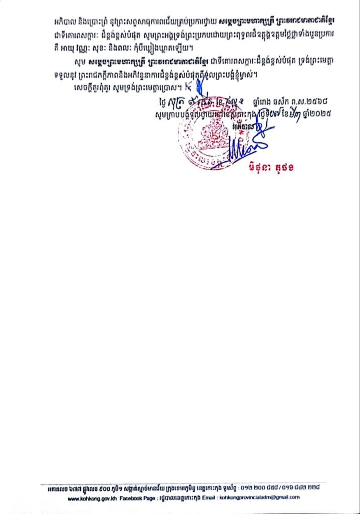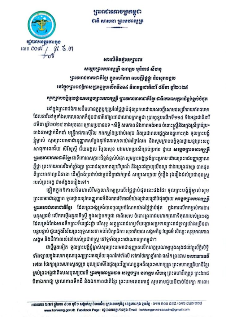 សារលិខិតថ្វាយព្រះពរ សម្តេចព្រះមហាក្សត្រី នរោត្តម មុនិនាថ សីហនុ ព្រះវររាជមាតាជាតិខ្មែរ ក្នុងសេរីភាព សេចក្តីថ្លៃថ្នូរ និងសុភមង្គល នៅក្នុងព្រះរាជឱកាសប្រារព្ធខួបលើកទី១១៤ ទិវាអន្តរជាតិនារី ៨មីនា ឆ្នាំ២០២៥