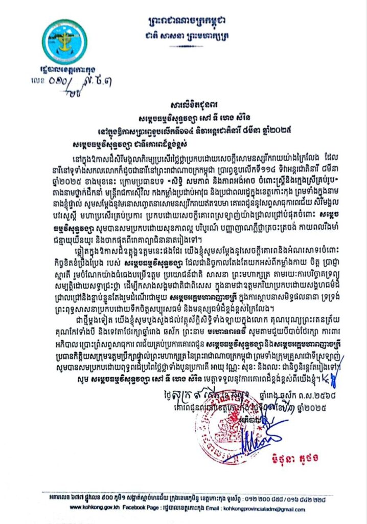 សារលិខិតជូនពរ សម្តេចធម្មវិសុទ្ធវង្សា សៅ ទី ហេង សំរិន នៅក្នុងឱកាសប្រារព្ធខួបលើកទី១១៤ ទិវាអន្តរជាតិនារី ៨មីនា ឆ្នាំ២០២៥