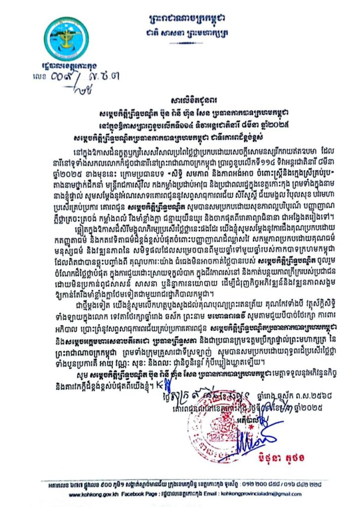 សារលិខិតជូនពរ សម្តេចកិត្តិព្រឹទ្ធបណ្ឌិត ប៊ុន រ៉ានី ហ៊ុន សែន ប្រធានកាកបាទក្រហមកម្ពុជា នៅក្នុងឱកាសប្រារព្ធខួបលើកទី១១៤ ទិវាអន្តរជាតិនារី ៨មីនា ឆ្នាំ២០២៥