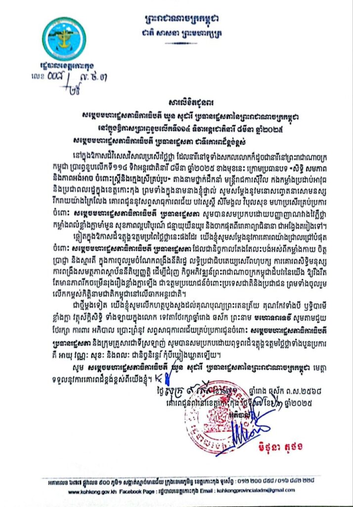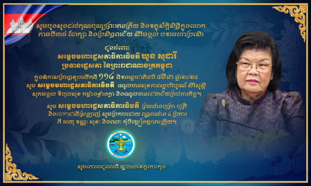 សារលិខិតជូនពរ សម្តេចមហារដ្ឋសភាធិការធិបតី យួន សុដារី ប្រធានរដ្ឋសភានៃព្រះរាជាណាចក្រកម្ពុជា នៅក្នុងឱកាសប្រារព្ធខួបលើកទី១១៤ ទិវាអន្តរជាតិនារី ៨មីនា ឆ្នាំ២០២៥