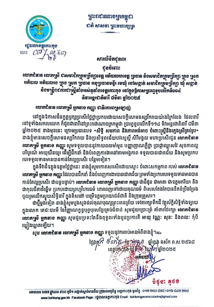 សារលិខិតជូនពរ ជូនចំពោះលោកជំទាវ លោកស្រី ជាសមាជិកក្រុមប្រឹក្សារខេត្ត អភិបាលរងខេត្ត ប្រធាន និងសមាជិកក្រុមប្រឹក្សា ក្រុង ស្រុក អភិបាល អភិបាលរង ក្រុង ស្រុក ប្រធាន អនុប្រធានមន្ទីរ មេឃុំ ចៅសង្កាត់ សមាជិកក្រុមប្រឹក្សា ឃុំ សង្កាត់ និងមន្ត្រីរាជការជាស្ត្រីទាំងអស់ទូទាំងខេត្តកោះកុង នៅក្នុងឱកាសប្រារព្ធខួបលើកទី១១៤ ទិវាអន្តរជាតិនារី ៨មីនា ឆ្នាំ២០២៥