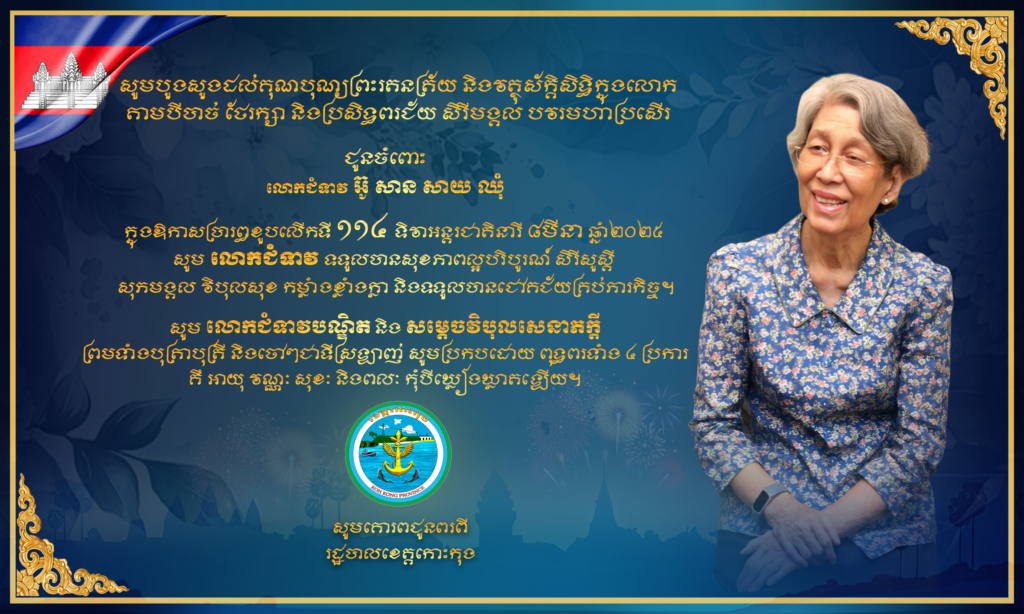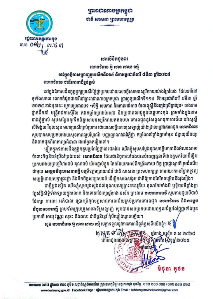 សារលិខិតជូនពរ លោកជំទាវ អ៊ូ សាន សាយ ឈុំ នៅក្នុងឱកាសប្រារព្ធខួបលើកទី១១៤ ទិវាអន្តរជាតិនារី ៨មីនា ឆ្នាំ២០២៥