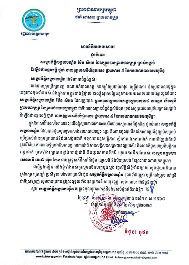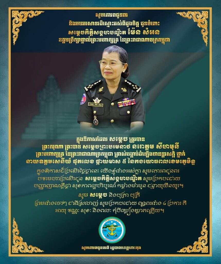 សូមគោរពជូនពរ និងអបអរសាទរដ៏ស្មោះអស់ពីដួងចិត្ត ជូនចំពោះ សម្តេចកិត្តិសង្គហបណ្ឌិត ម៉ែន សំអន ឧត្តមប្រឹក្សាផ្ទាល់ព្រះមហាក្សត្រ នៃព្រះរាជាណាចក្រកម្ពុជា ក្នុងឱកាសដែល សម្តេច ត្រូវបាន ព្រះករុណា ព្រះបាទ សម្តេចព្រះបរមនាថ នរោត្តម សីហមុនី ព្រះមហាក្សត្រ នៃព្រះរាជាណាច្រកម្ពុជា ត្រាស់បង្គាប់ដំឡើងឋានន្តរសក្តិ ថ្នាក់ នាយឧត្តមសេនីយ៍ ផុតលេខ ផ្កាយមាស ៥ នៃកងយោធពលខេមរភូមិន្ទ