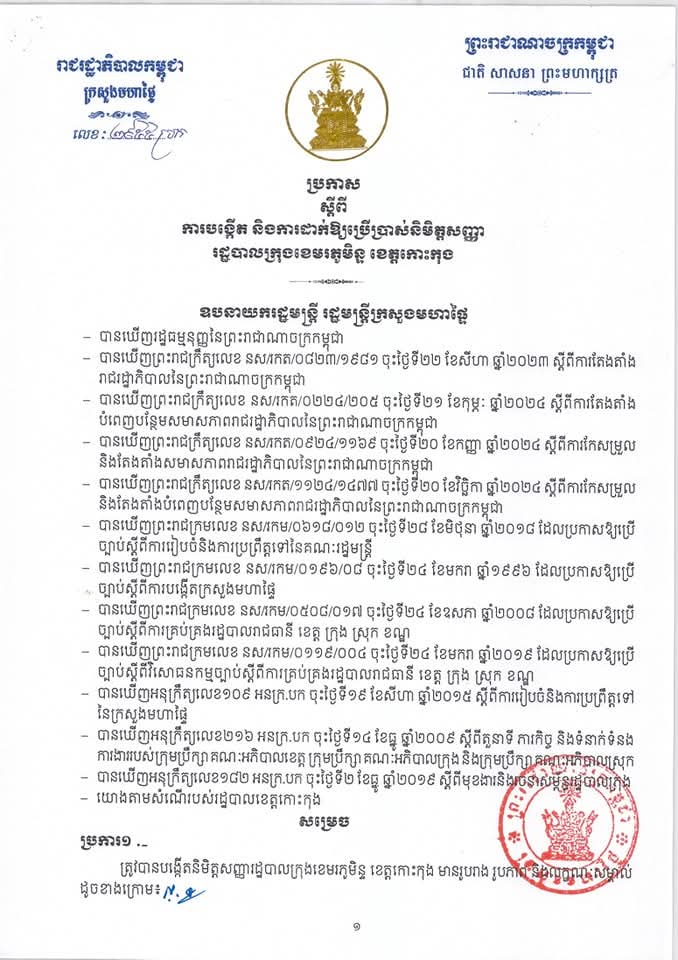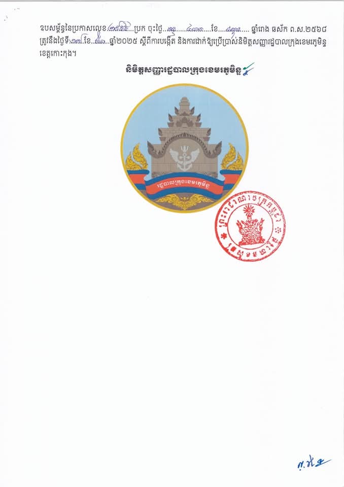 ប្រកាស ស្តីពីការបង្កើត និងការដាក់ឱ្យប្រើប្រាស់និមិត្តសញ្ញា រដ្ឋបាលក្រុងខេមរភូមិន្ទ ខេត្តកោះកុង