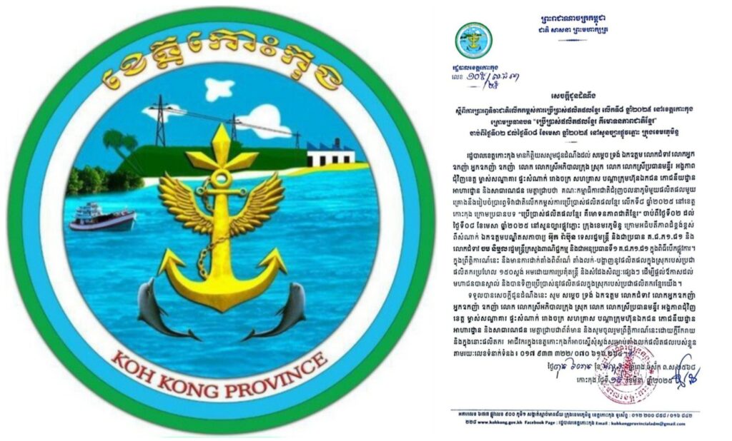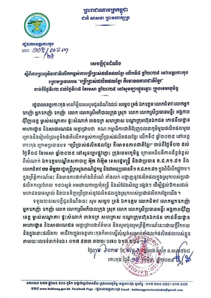 សេចក្តីជូនដំណឹង ស្តីពីការប្រារព្ធទិវាជាតិលើកកម្ពស់ការប្រើប្រាស់ផលិតផលខ្មែរ លើកទី៨ ឆ្នាំ២០២៥ នៅខេត្តកោះកុង ក្រោមប្រធានបទ “ប្រើប្រាស់ផលិតផលខ្មែរ គឺមោទនភាពជាតិខ្មែរ” ចាប់ពីថ្ងៃទី០២ ដល់ថ្ងៃទី០៨ ខែមេសា ឆ្នាំ២០២៥ នៅសួនច្បារដូចភ្លោះ ក្រុងខេមរភូមិន្ទ