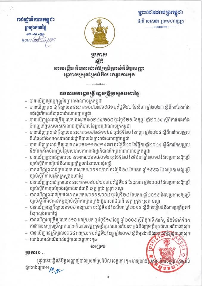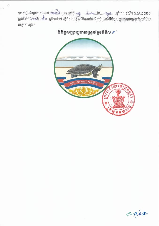 ប្រកាស ស្តីពីការបង្កើត និងការដាក់ឱ្យប្រើប្រាស់និមិត្តសញ្ញា រដ្ឋបាលស្រុកស្រែអំបិល ខេត្តកោះកុង