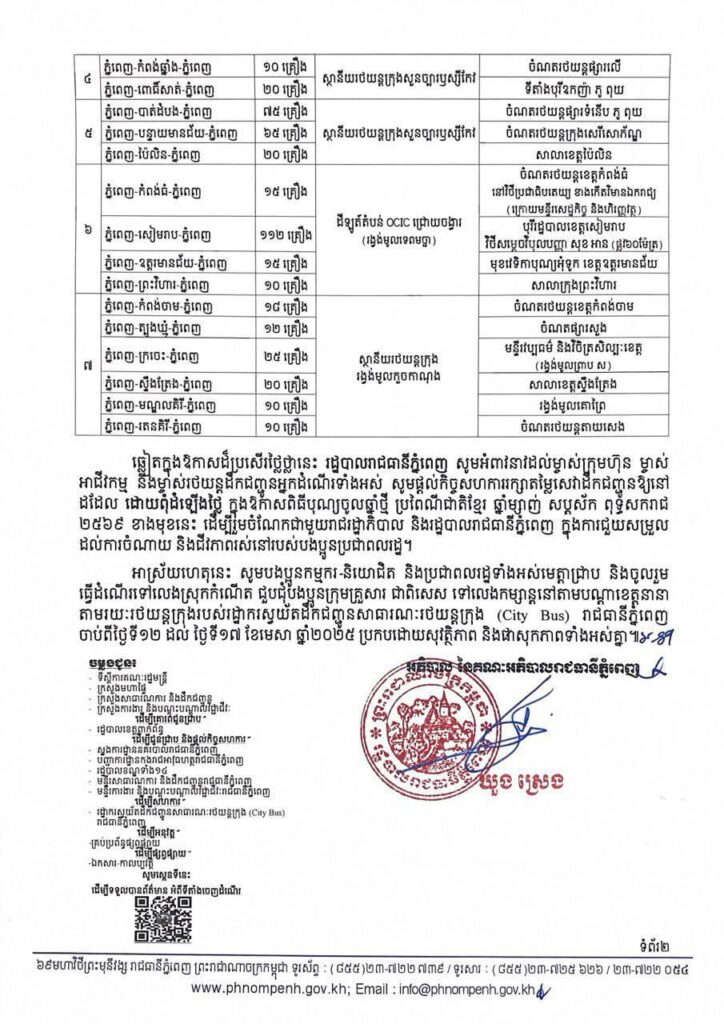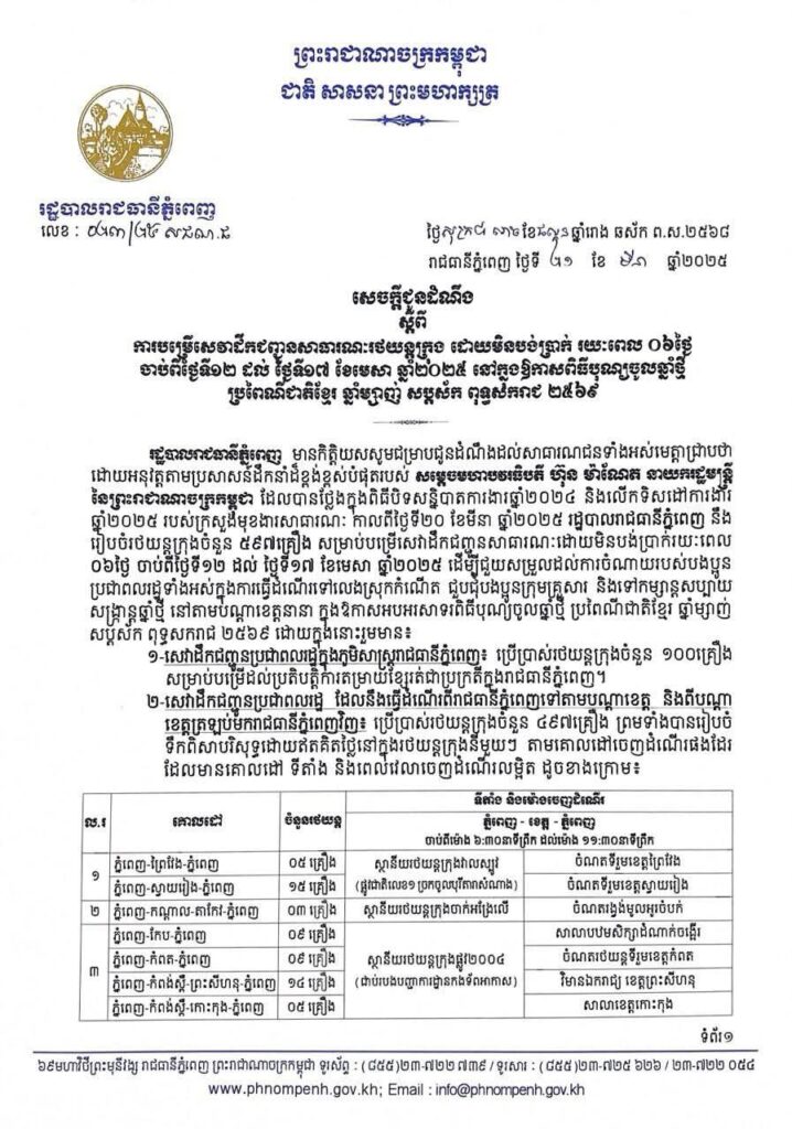 សេចក្តីជូនដំណឹង ស្តីពីការបម្រើសេវាដឹកជញ្ជូនសាធារណៈរថយន្តក្រុង ដោយមិនបង់ប្រាក់ រយៈពេល ០៦ថ្ងៃ ចាប់ពីថ្ងៃទី១២ ដល់ ថ្ងៃទី១៧ ខែមេសា ឆ្នាំ២០២៥ នៅក្នុងឱកាសពិធីបុណ្យចូលឆ្នាំថ្មី ប្រពៃណីជាតិខ្មែរ ឆ្នាំម្សាញ់ សប្តស័ក ពុទ្ធសករាជ ២៥៦៩ នៅមុខសាលាខេត្តកោះកុង និងស្ថានីយ៍រថយន្តក្រុងផ្លូវ២០០៤ (ជាប់របងបញ្ជាការដ្ឋានកងទ័ពអាកាស)