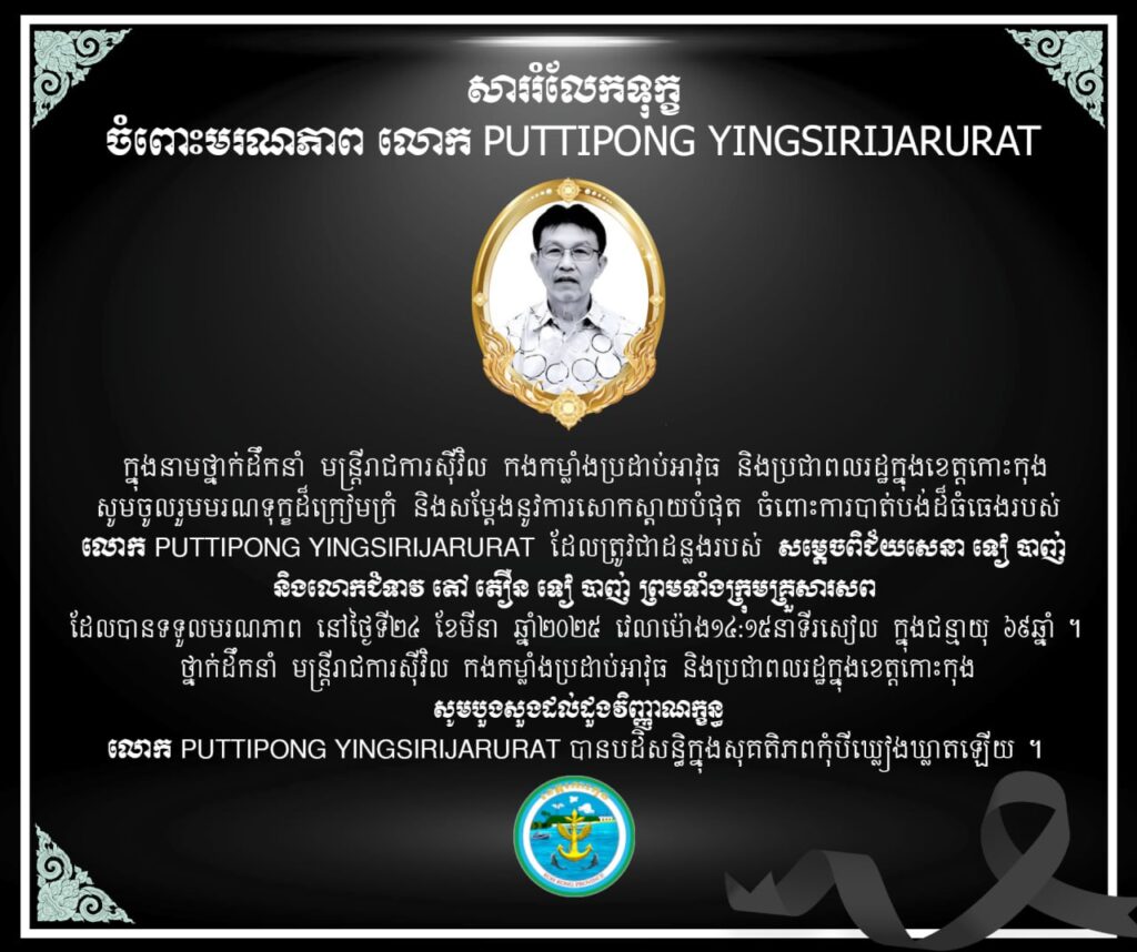 ក្នុងនាមថ្នាក់ដឹកនាំ មន្ត្រីរាជការស៊ីវិល កងកម្លាំងប្រដាប់អាវុធ និងប្រជាពលរដ្ឋក្នុងខេត្តកោះកុង សូមចូលរួមមរណទុក្ខដ៏ក្រៀមក្រំ និងសម្តែងនូវការសោកស្តាយបំផុត ចំពោះការបាត់បង់ដ៏ធំធេងរបស់ លោក PUTTIPONG YINGSIRIJARURAT ដែលត្រូវជាដន្លងរបស់ សម្តេចពិជ័យសេនា ទៀ បាញ់ និងលោកជំទាវ តៅ តឿន ទៀ បាញ់ ព្រមទាំងក្រុមគ្រួសារសព