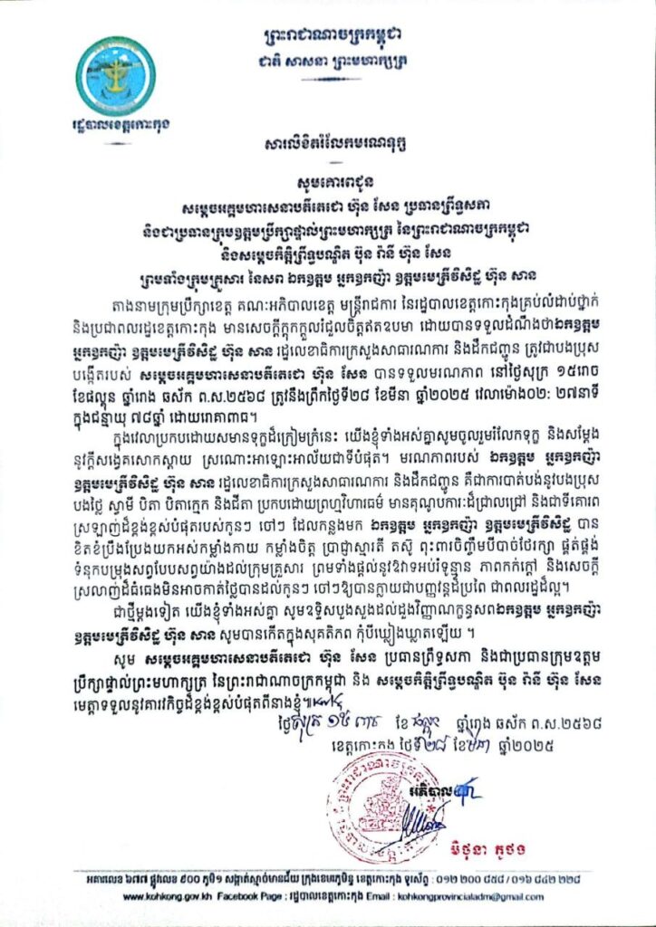 សារលិខិតរំលែកមរណទុក្ខ សូមគោរពជូនសម្តេចអគ្គមហាសេនាបតីតេជោ ហ៊ុន សែន ប្រធានព្រឹទ្ធសភា និងជាប្រធានក្រុមឧត្តមប្រឹក្សាផ្ទាល់ព្រះមហាក្សត្រ នៃព្រះរាជាណាចក្រកម្ពុជា និងសម្តេចកិត្តិព្រឹទ្ធបណ្ឌិត ប៊ុន រ៉ានី ហ៊ុន សែន ព្រមទាំងក្រុមគ្រួសារ នៃសព ឯកឧត្តម អ្នកឧកញ៉ា ឧត្តមមេត្រីវិសិដ្ឋ ហ៊ុន សាន