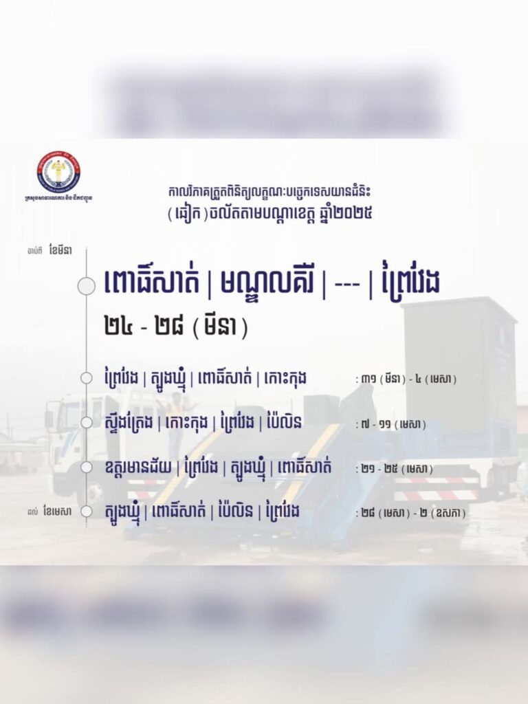 មន្ទីរសាធារណការ និងដឹកជញ្ជូនខេត្តកោះកុង សូមជូនដំណឹង ស្តីពីឆៀកចល័តតាមខេត្ត នឹងដំណើរការនៅខេត្តកោះកុងចាប់ពីថ្ងៃទី៣១ ខែមីនា ដល់ថ្ងៃទី០៤ ខែមេសា និងចាប់ពីថ្ងៃទី០៧ ដល់ ១១ ខែមេសា ឆ្នាំ២០២៥