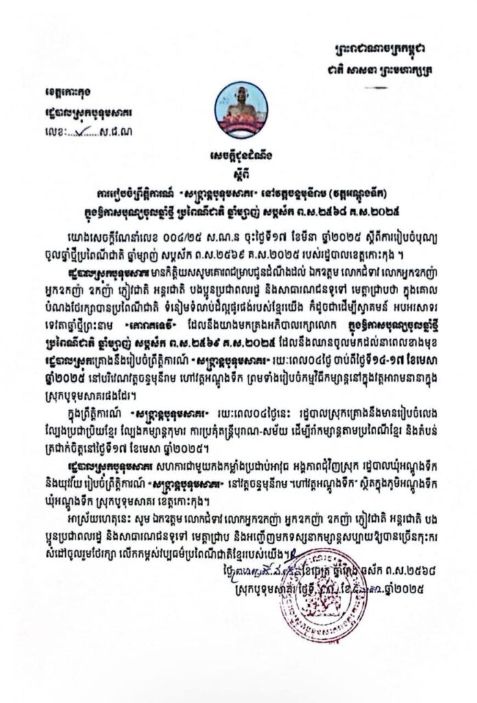 រដ្ឋបាលស្រុកបូទុមសាគរ មានកិត្តិយសសូមគោរពជម្រាបជូនដំណឹងដល់ ឯកឧត្តម លោកជំទាវ លោកអ្នកឧកញ៉ា អ្នកឧកញ៉ា ឧកញ៉ា ភ្ញៀវជាតិ អន្តរជាតិ បងប្អូនប្រជាពលរដ្ឋ និងសាធារណជនទូទៅ មេត្តាជ្រាបថា ក្នុងគោលបំណងថែរក្សាបានប្រពៃណីជាតិ ទំនៀមទំលាប់ដ៏ល្អផូរផង់របស់ខ្មែរយើង ក៏ដូចជាដើម្បីស្វាគមន៍ អបអរសាទរទេវតាឆ្នាំថ្មីព្រះនាម »គោរាគទេវី» ដែលនឹងយាងមកគ្រងអភិបាលរក្សាលោក ក្នុងឱកាសបុណ្យចូលឆ្នាំថ្មីប្រពៃណីជាតិ ឆ្នាំម្សាញ់ សប្តស័ក ព.ស.២៥៦៩ គ.ស.២០២៥ ដែលនឹងឈានចូលមកដល់នាពេលខាងមុខ រដ្ឋបាលស្រុកគ្រោងនឹងរៀបចំព្រឹត្តិការណ៍ «សង្រ្កាន្តបូទុមសាគរ» រយៈពេល០៤ថ្ងៃ ចាប់ពីថ្ងៃទី១៤-១៧ ខែមេសា ឆ្នាំ២០២៥ នៅបរិវេណវត្តចន្ទមុនីរាម ហៅវត្តអណ្តូងទឹក