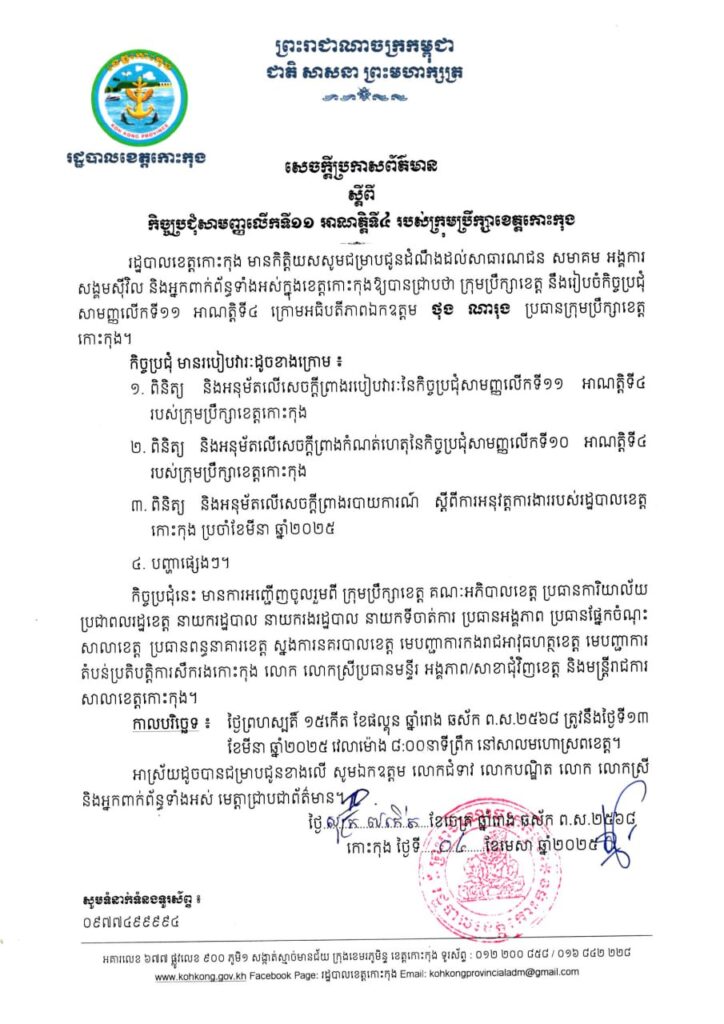 សេចក្ដីប្រកាសព័ត៌មាន ស្ដីពីកិច្ចប្រជុំសាមញ្ញលើកទី១១ អាណត្តិទី៤ របស់ក្រុមប្រឹក្សាខេត្តកោះកុង