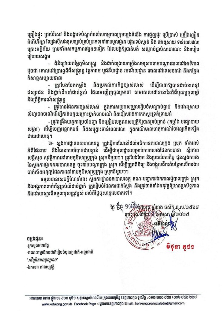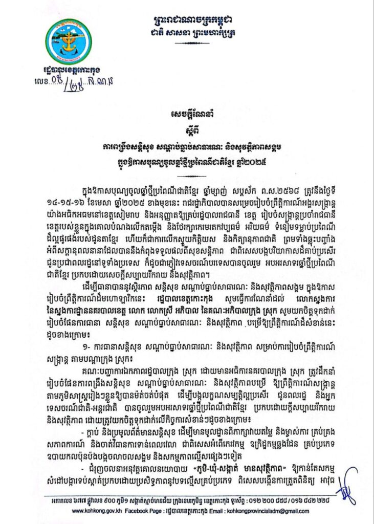 សេចក្តីណែនាំ ស្តីពីការពង្រឹងសន្តិសុខ សណ្តាប់ធ្នាប់សាធារណៈ និងសុវត្ថិភាពសង្គម ក្នុងឱកាសបុណ្យចូលឆ្នាំថ្មីប្រពៃណីជាតិខ្មែរ ឆ្នាំ២០២៥