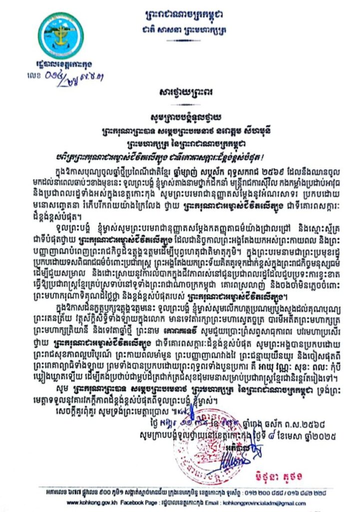 សារថ្វាយព្រះពរ សូមក្រាបបង្គំទូលថ្វាយ ព្រះករុណាព្រះបាទ សម្តេចព្រះបរមនាថ នរោត្តម សីហមុនី ព្រះមហាក្សត្រ នៃព្រះរាជាណាចក្រកម្ពុជា ក្នុងឱកាសបុណ្យចូលឆ្នាំថ្មីប្រពៃណីជាតិខ្មែរ ឆ្នាំម្សាញ់ សប្តស័ក ពុទ្ធសករាជ ២៥៦៩ ក្រាបបង្គំទូលថ្វាយពី រដ្ឋបាលខេត្តកោះកុង និងប្រជាពលរដ្ឋទូទាំងខេត្តកោះកុង