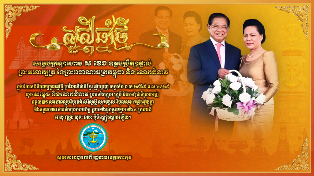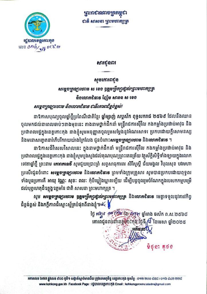 សារជូនពរ សូមគោរពជូន សម្តេចក្រឡាហោម ស ខេង ឧត្តមប្រឹក្សាផ្ទាល់ព្រះមហាក្សត្រ និងលោកជំទាវ ញ៉ែម សាខន ស ខេង ក្នុងឱកាសពិធីបុណ្យចូលឆ្នាំថ្មី ប្រពៃណីជាតិខ្មែរ ឆ្នាំម្សាញ់ សប្តស័ក ព.ស.២៥៦៩ គ.ស.២០២៥ សូមគោរពជូនពរពី រដ្ឋបាលខេត្តកោះកុង