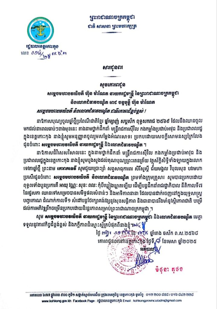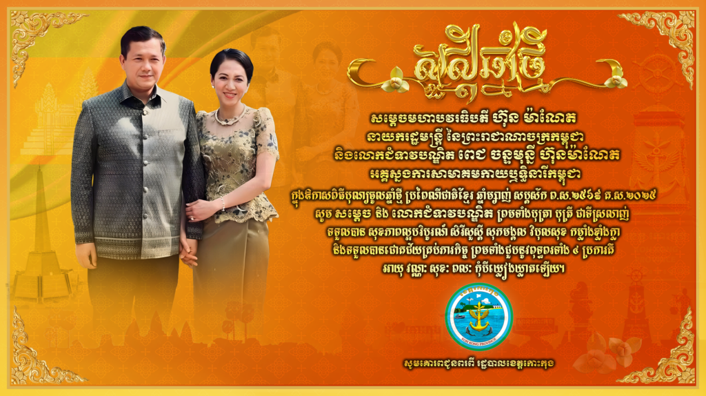 សារជូនពរ សូមគោរពជូន សម្តេចមហាបវរធិបតី ហ៊ុន ម៉ាណែត នាយករដ្ឋមន្ត្រី នៃព្រះរាជាណាចក្រកម្ពុជា និងលោកជំទាវបណ្ឌិត ពេជ ចន្ទមុន្នី ហ៊ុន ម៉ាណែត ក្នុងឱកាសពិធីបុណ្យចូលឆ្នាំថ្មី ប្រពៃណីជាតិខ្មែរ ឆ្នាំម្សាញ់ សប្តស័ក ព.ស.២៥៦៩ គ.ស.២០២៥ សូមគោរពជូនពរពី រដ្ឋបាលខេត្តកោះកុង