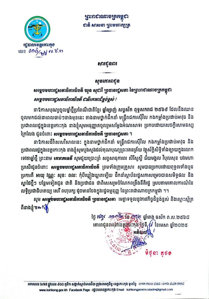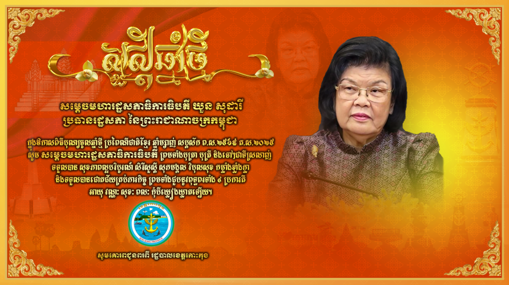 សារជូនពរ សូមគោរពជូន សម្តេចមហារដ្ឋសភាធិការធិបតី ឃួន សុដារី ប្រធានរដ្ឋសភា នៃព្រះរាជាណាចក្រកម្ពុជា ក្នុងឱកាសពិធីបុណ្យចូលឆ្នាំថ្មី ប្រពៃណីជាតិខ្មែរ ឆ្នាំម្សាញ់ សប្តស័ក ព.ស.២៥៦៩ គ.ស.២០២៥ សូមគោរពជូនពរពី រដ្ឋបាលខេត្តកោះកុង