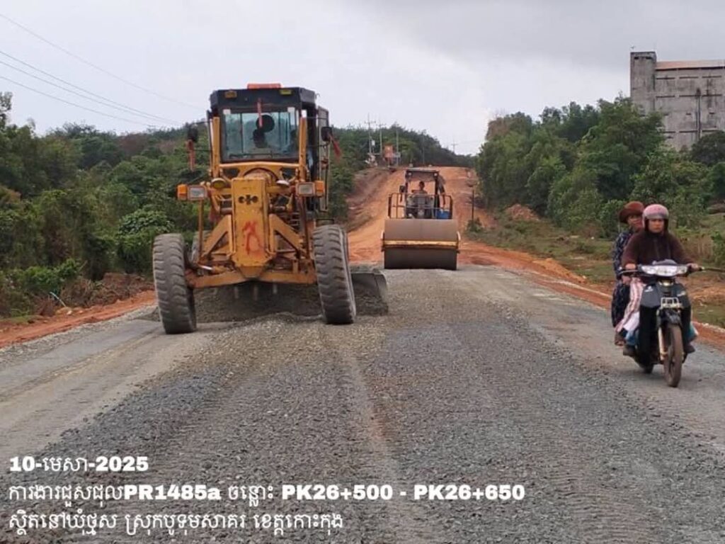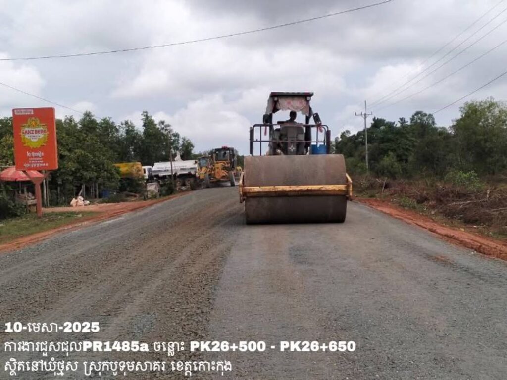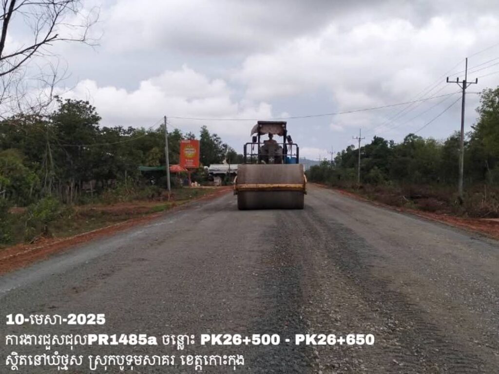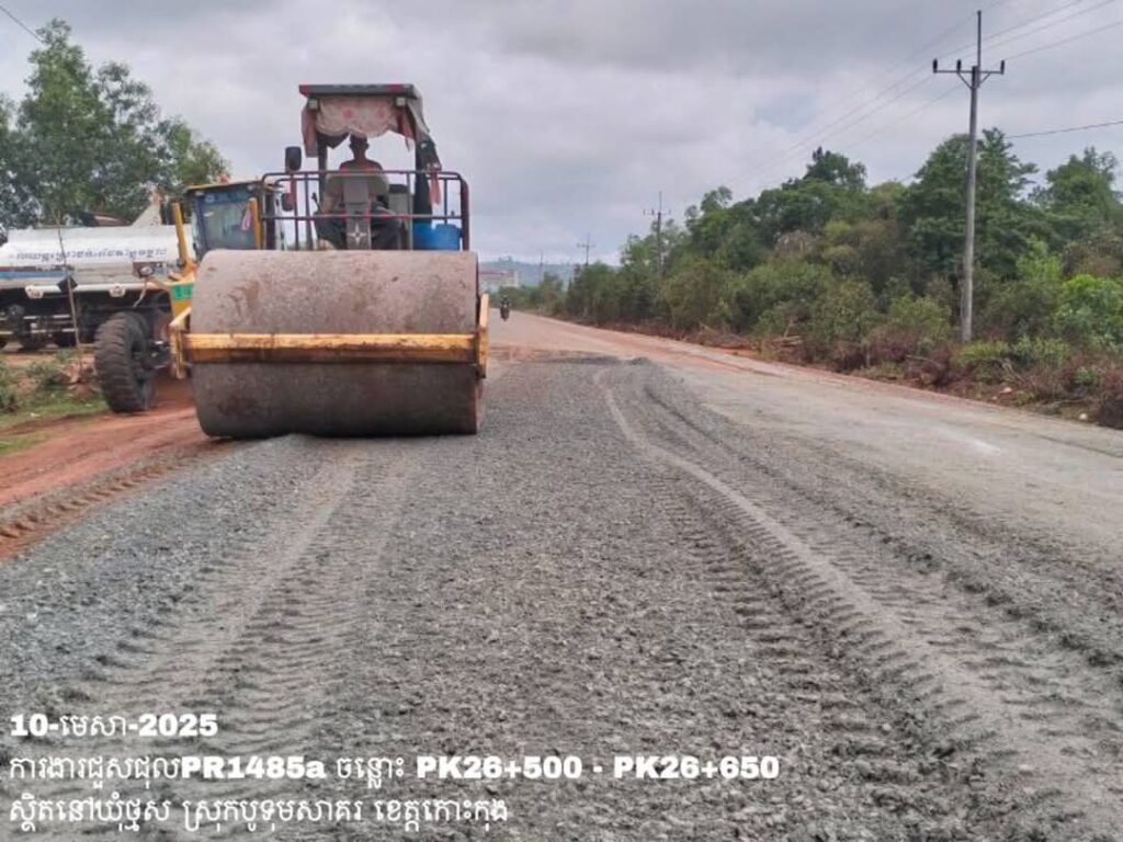 -បន្តថែទាំខួបលើផ្លូវខេត្តលេខ1485a ឃុំថ្មស ស្រុកបូទុមសាគរ ខេត្តកោះកុង ការងារចាក់ល្បាយថ្មម៉ិចរួច កៀរ កិន បង្ហាប់ ធ្វើគ្រឹះសំខាន់ ត្រង់ចន្លោះ PK26+500 – PK26+650។