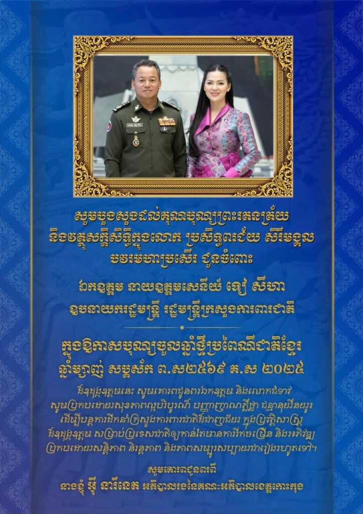 សូមបួងសួងដល់គុណបុណ្យព្រះរតនត្រ័យ និងវត្ថុសក្តិសិទ្ធិក្នុងលោក ប្រសិទ្ធពរជ័យ សិរីមង្គល បវរមហាប្រសើរ ជូនចំពោះ ឯកឧត្តម នាយឧត្តមសេនីយ៍ ទៀ សីហា ឧបនាយករដ្ឋមន្ត្រី រដ្ឋមន្ត្រីក្រសួងការពារជាតិ សូមគោរពជូនពរពី លោកស្រី អ៉ី នារីនេត អភិបាលរង នៃគណៈអភិបាលខេត្តកោះកុង