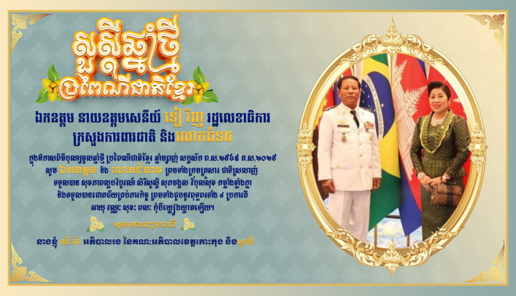 សូមគោរពជូនពរ ឯកឧត្តម នាយឧត្តមសេនីយ៍ ទៀ វិញ រដ្ឋលេខាធិការ ក្រសួងការពារជាតិ និងលោកជំទាវ ក្នុងឱកាសពិធីបុណ្យចូលឆ្នាំថ្មី ប្រពៃណីជាតិខ្មែរ ឆ្នាំម្សាញ់ សប្តស័ក ព.ស.២៥៦៩ គ.ស.២០២៥ សូមគោរពជូនពរពីនាងខ្ញុំ ឈី វ៉ា អភិបាលរង នៃគណៈអភិបាលខេត្តកោះកុង និងស្វាមី