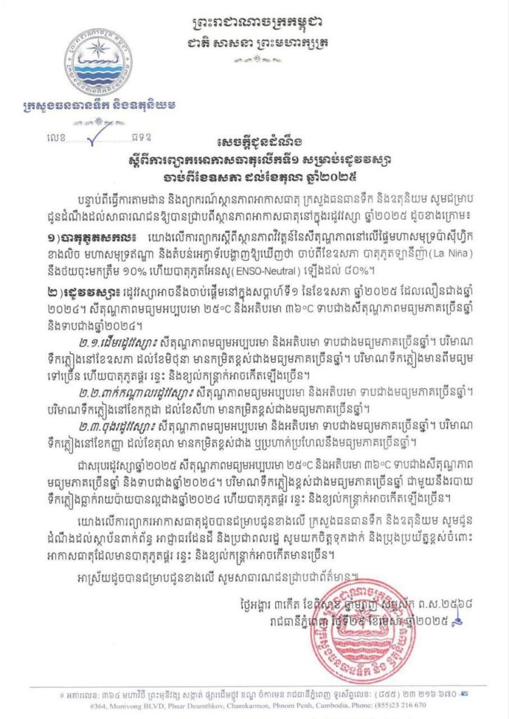 សេចក្តីជូនដំណឹង ស្តីពីការព្យាករអាកាសធាតុលើកទី១ សម្រាប់រដូវវស្សា ចាប់ពីខែឧសភា ដល់ខែតុលា ឆ្នាំ២០២៥
