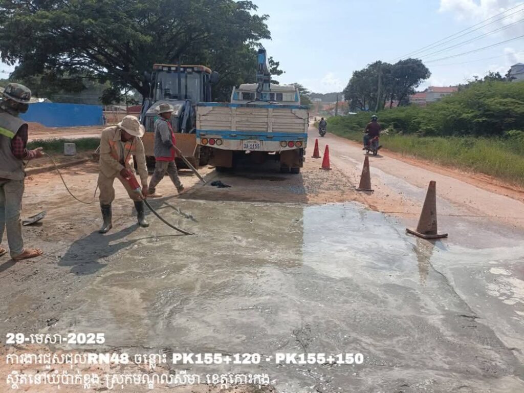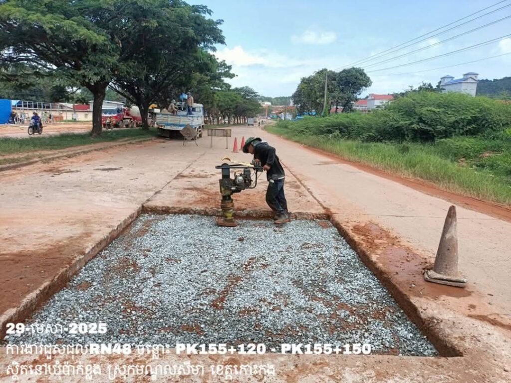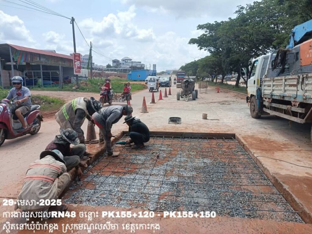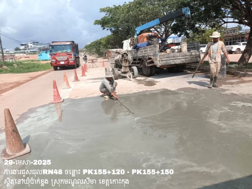 -បន្តថែទាំប្រចាំលើផ្លូវជាតិលេខ48 ឃុំប៉ាក់ខ្លង ស្រុកមណ្ឌលសីមា ខេត្តកោះកុង ការងារធ្វើគ្រឹះ រួចចាក់បេតុងសរសៃដែកជួសជុលសំបុកមាន់ ត្រង់ចន្លោះ PK155+120 – PK155+150។