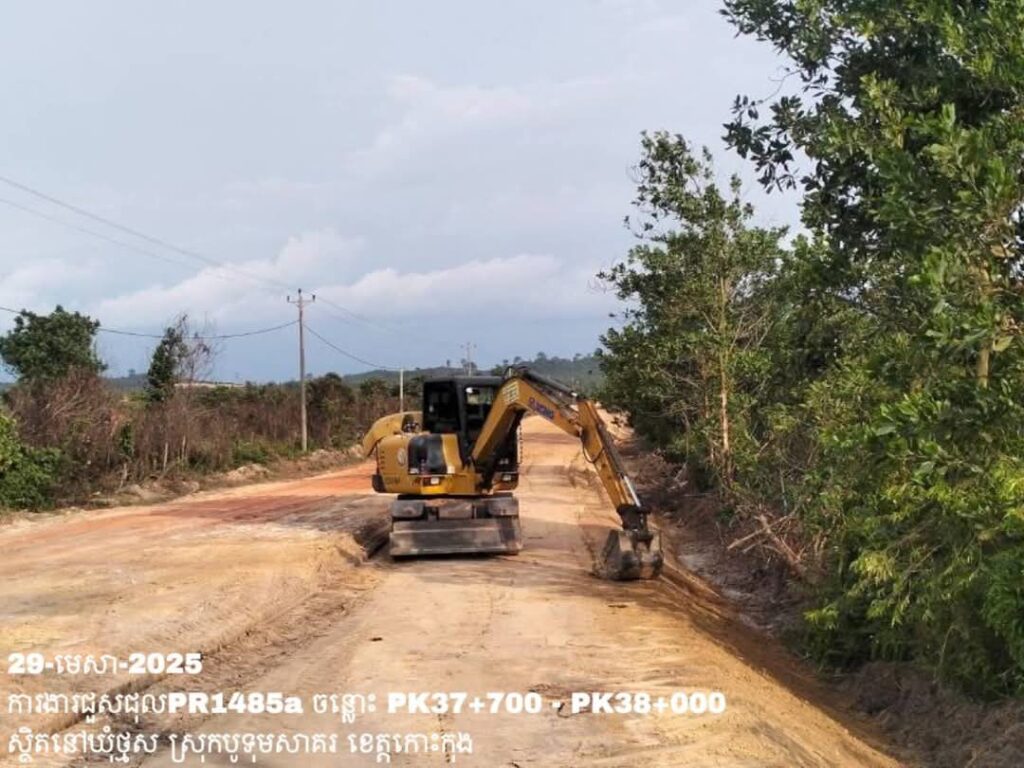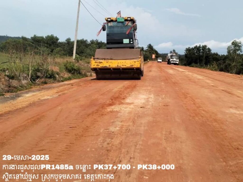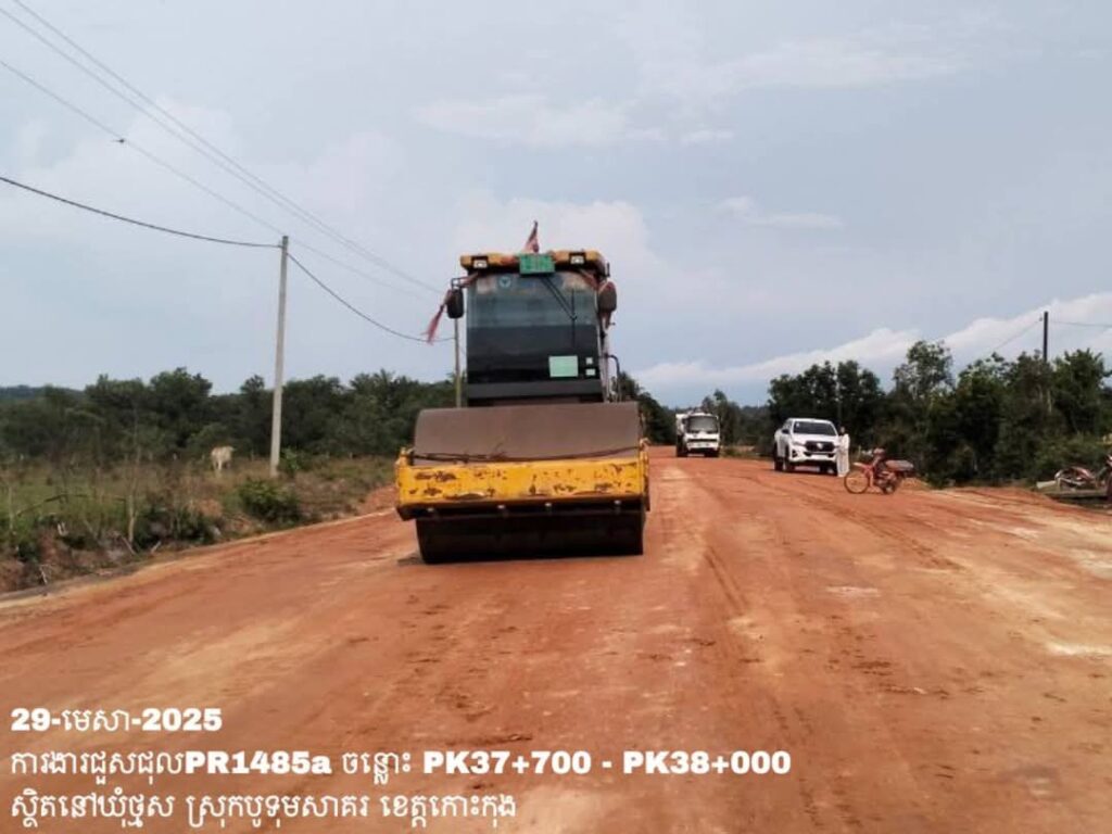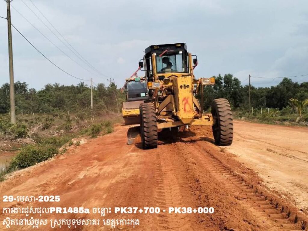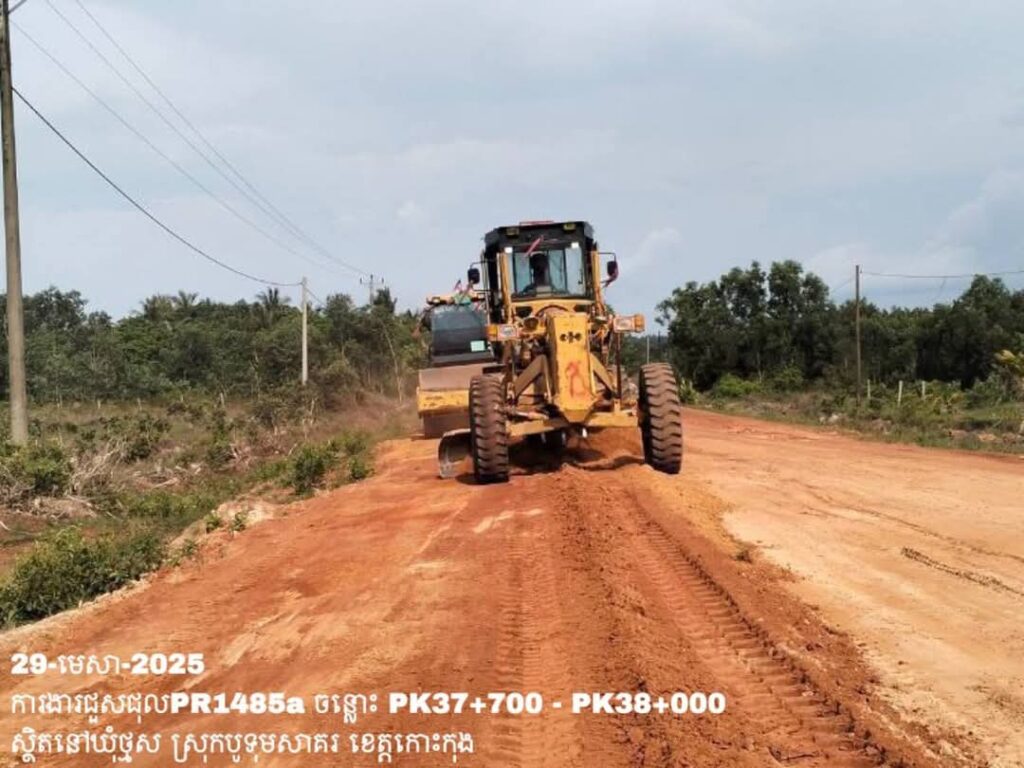 -បន្តថែទាំខួបលើផ្លូវខេត្តលេខ1485a ឃុំថ្មស ស្រុកបូទុមសាគរ ខេត្តកោះកុង ការងារ កៀរ កិន បង្ហាប់សម្រួលតួថ្នល់ចាស់ ត្រង់ចន្លោះ PK37+700 – PK38+000។