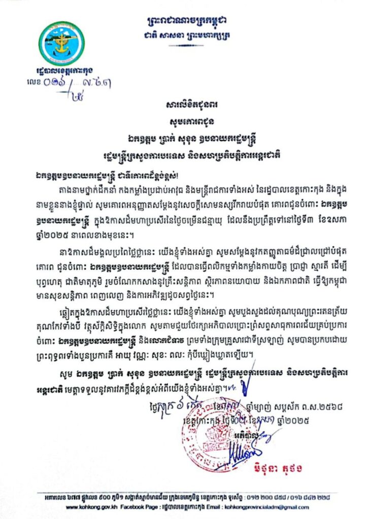 សារលិខិតជូនពរ សូមគោរពជូន ឯកឧត្តម ប្រាក់ សុខុន ឧបនាយករដ្ឋមន្ត្រី រដ្ឋមន្ត្រីក្រសួងការបរទេស និងសហប្រតិបត្តិការអន្តរជាតិ