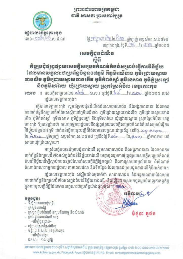 សេចក្តីជូនដំណឹង ស្តីពីកិច្ចប្រជុំផ្សព្វផ្សាយសេចក្តីសម្រេចកំណត់តំបន់សម្រាប់ធ្វើការវិនិច្ឆ័យ ដែលមានលក្ខណៈជាប្រព័ន្ធចំនួន០៧ភូមិ គឺភូមិឈើនាង ភូមិជ្រោយស្វាយខាងលិច ភូមិជ្រោយស្វាយខាងកើត ភូមិកំពង់ស្តាំ ភូមិនេសាទ ភូមិភ្នំស្រឡៅ និងភូមិសារ៉ាយ ឃុំជ្រោយស្វាយ ស្រុកស្រែអំបិល ខេត្តកោះកុង